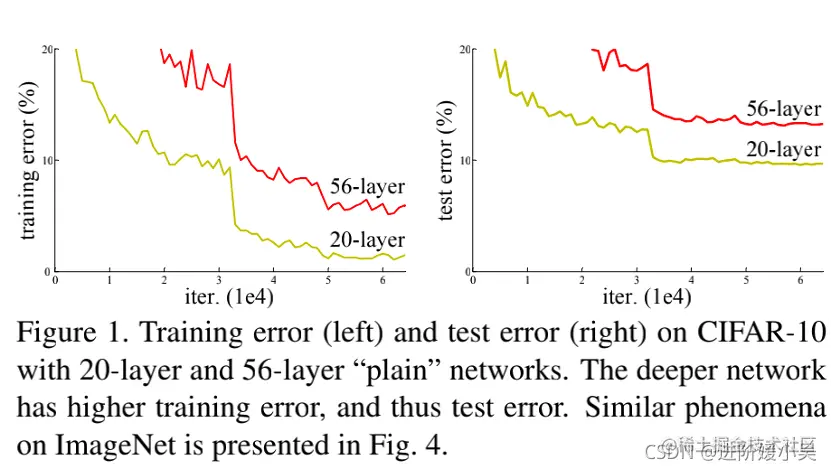 当更深的网络能够开始收敛时,暴露了一个退化问题:随着网络深度的增加,准确率达到饱和,然后迅速下降。意外的是,这种退化不是由过拟合引起的,并且在适当的深度模型上添加更多的层会导致更高的训练误差。