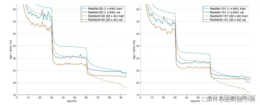 ImageNet-1K的训练曲线。(左):ResNet/ResNeXt-50,保留了复杂性(41亿FLOPs,2500万参数);(右)。保留复杂性的ResNet/ResNeXt-101(78亿FLOPs,4400万参数)。