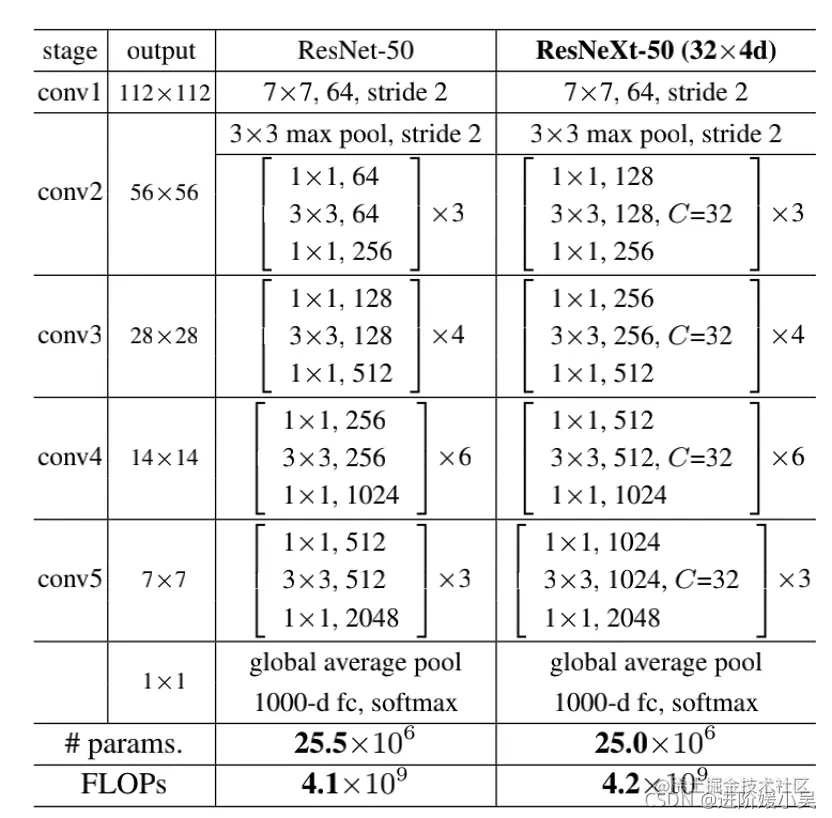 左)ResNet-50。(右)带有32×4d模板的ResNeXt-50(使用图3(c)中的重构)。括号内是残块的形状,括号外是舞台上堆叠的块数。“C=32”建议分组卷积有32个组。这两个模型之间的参数数量和FLOPs相似。