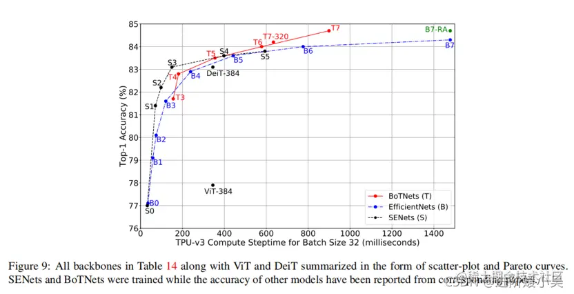 - 在ImageNet上BoTNet高达84.7%的top-1精度,性能优于SENet、EfficientNet等