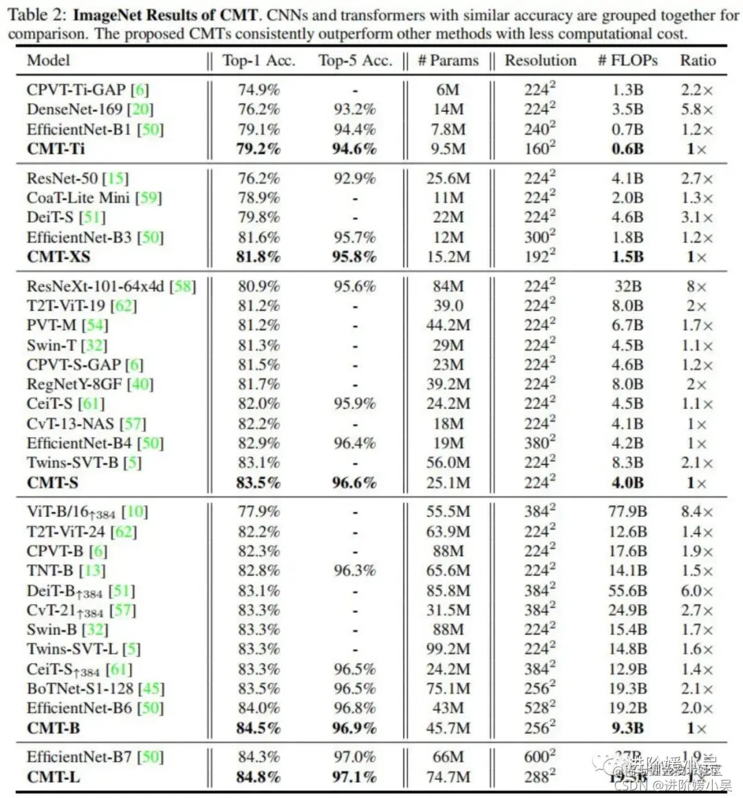 - 所提CMT-S比EfficientNet-B4指标高0.6%,同时具有更低的计算复杂度。