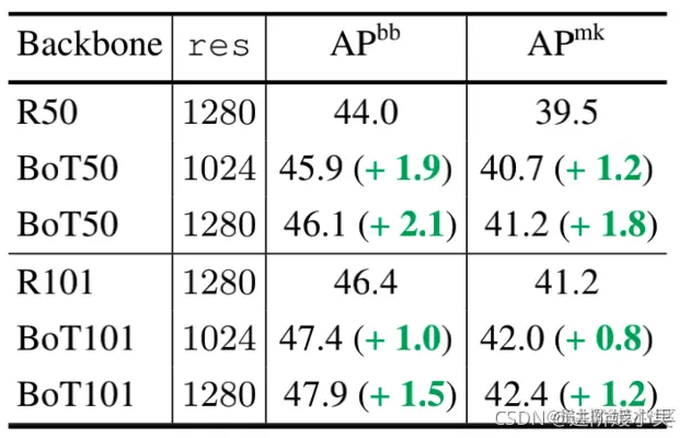 - 在没有任何附加条件的情况下,BoTNet使用Mask R-CNN框架在COCO实例分割基准上取得了44.4%的MaskAP和49.7%的Box AP;