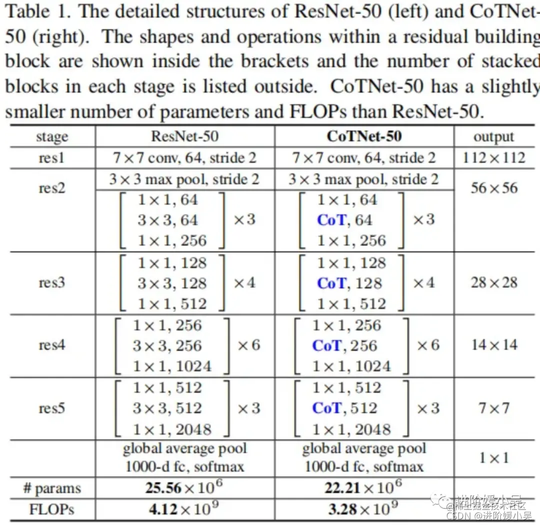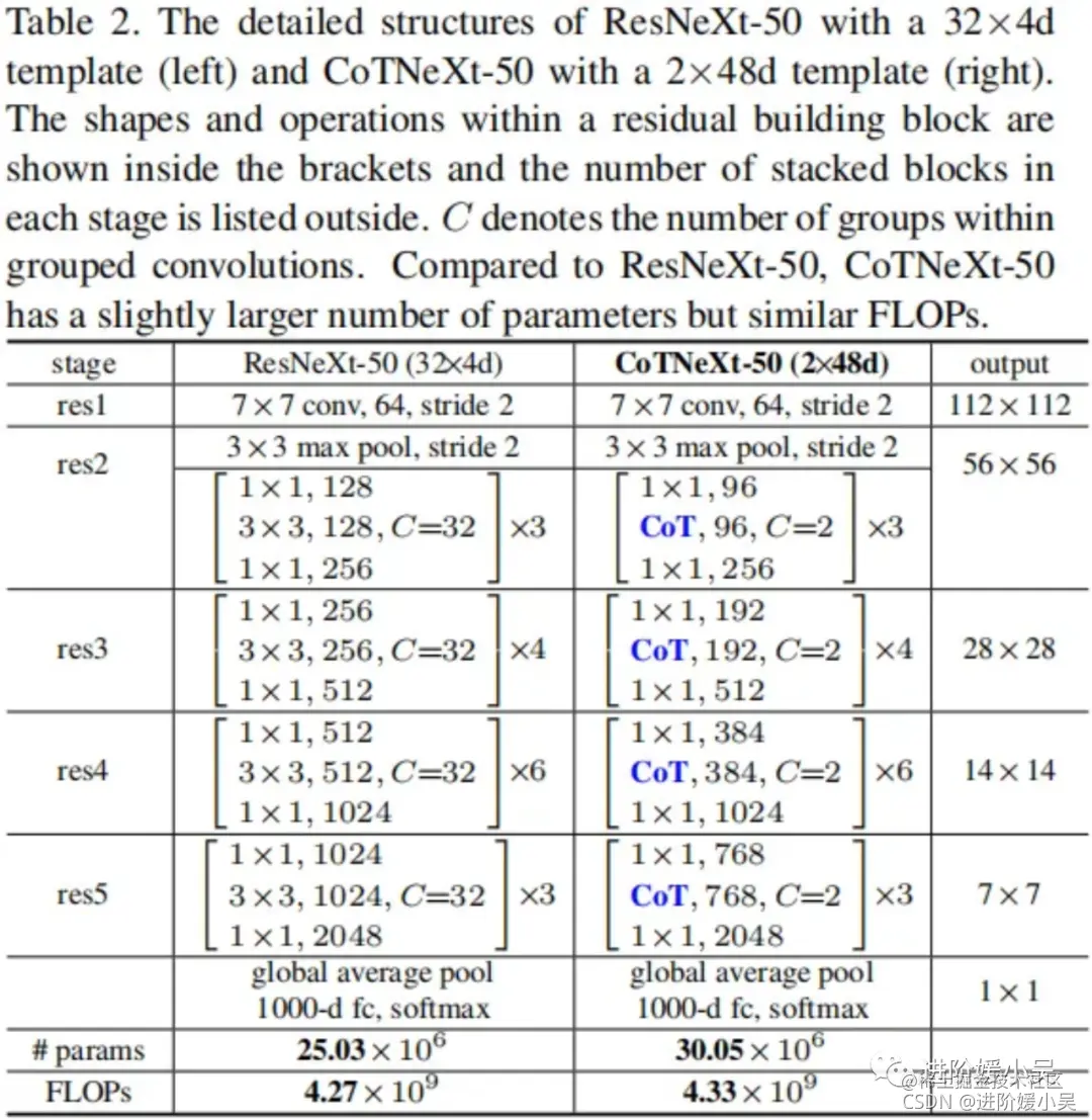 具体来说,CoTNet-50直接采用CoT替换Bottlenck中的卷积;类似的,CoTNeXt-50采用CoT模块替换对应的组卷积,为获得相似计算量,对通道数、分组数进行了调整:CoTNeXt-50的参数量是ResNeXt-50的1.2倍,FLOPs则是1.01倍。