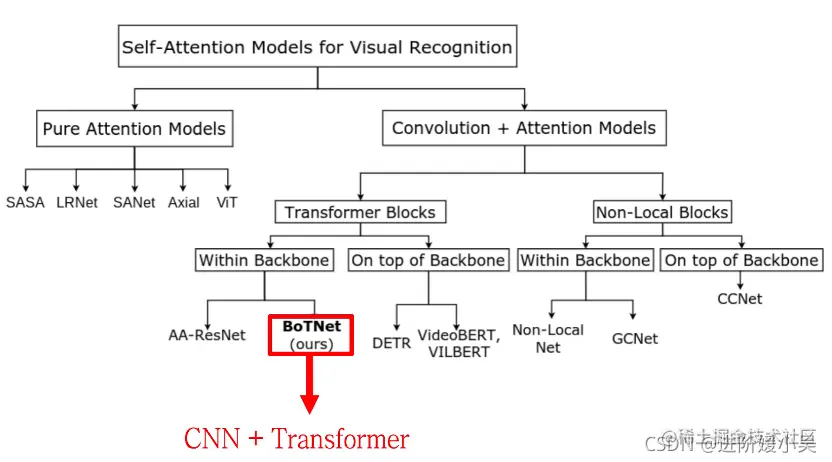 BoTNet是一个混合模型(CNN + Transformer)。近期华为诺亚也使用这种混合模型提出了CMT。