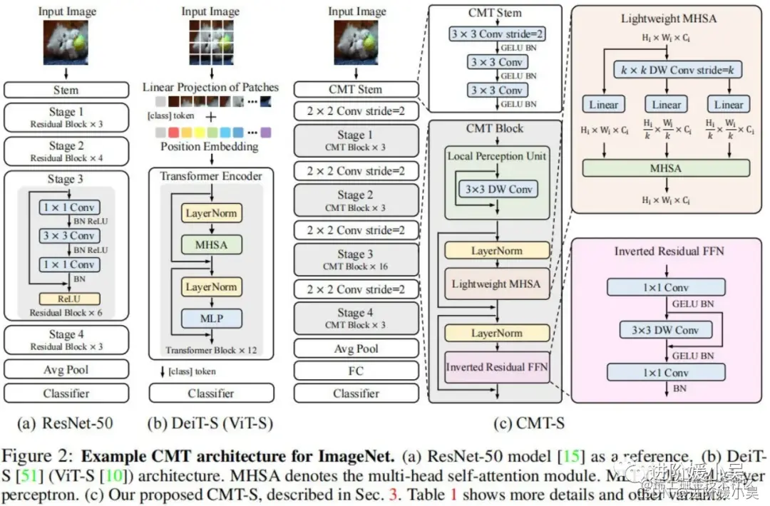 类似经典CNN(如ResNet)架构设计,所提CMT包含四个阶段以生成多尺度特征(这对于稠密预测任务非常重要)。为生成分层表达,在每个阶段开始之前采用卷积降低特征分辨率并提升通道维度。在每个阶段,堆叠多个CMT模块进行特征变换同时保持特征分辨率不变,每个CMT模块可以同时捕获局部与长距离依赖关系。在模型的尾部,我们采用GAP+FC方式进行分类。