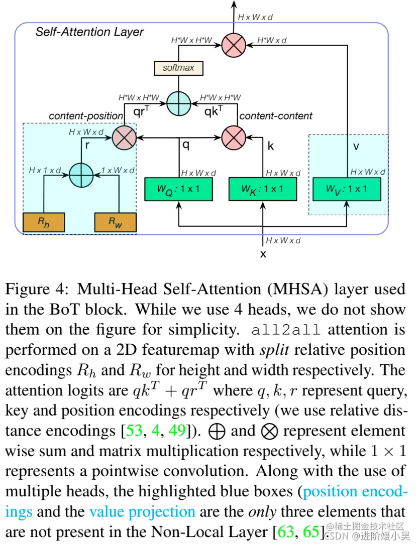 3、输出投影,Transformer中的MHSA包含一个输出投影,BoTNet则没有。
