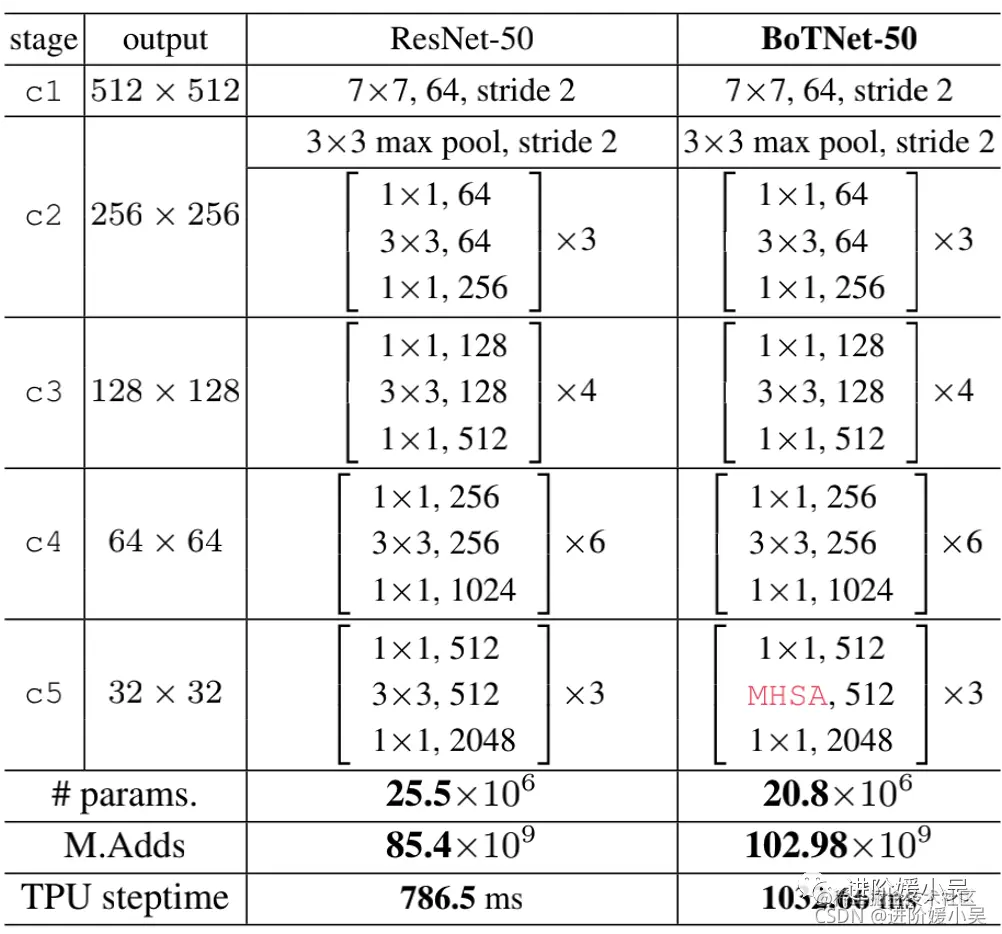 上图是ResNet-50和BoTNet-50的区别,唯一的不同在c5。而且BoTNe-50t的参数量只有ResNet-50的0.82倍,但是steptime略有增加。