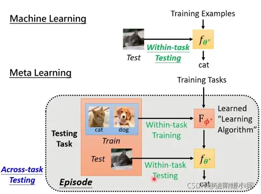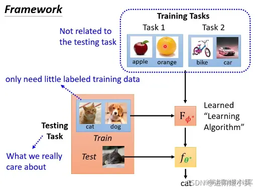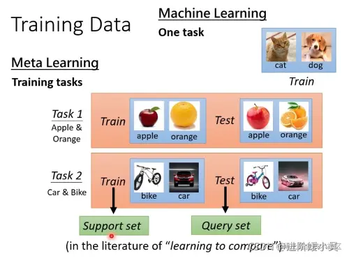 meta learning 是学习如何学习,few-shot learning 是要达到的目标(用一点点训练资料就可以训练出我们要的结果)。为什么觉得meta learning 和few-shot learning 像呢?就是希望达到few-shot learning,想要一个学习演算法只看到一点点资料就可以学起来。few-shot learning的Algorithm往往是用meta learning 得到的。