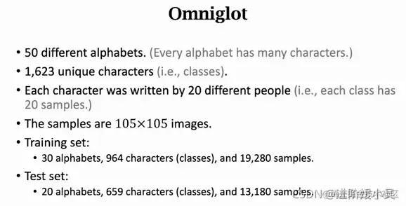 常用的数据集:Omniglot是meta learning最常用的数据集。这个数据集不大,只有几兆,很适合学术界使用。Omniglot有点类似MNIST。MNIST有10个类每个勒有6000个样本;Omniglot的类别很多,每个类的样本却很少,有1600多个类,每个类只有20个样本。