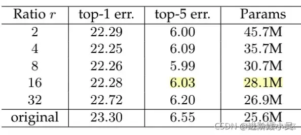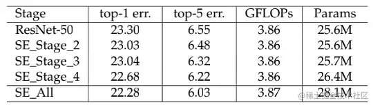 其中r表示缩减率,S表示阶段数(阶段是指在公共空间维度的特征图上操作的块的集合),Cs表示输出通道的维度,Ns表示阶段重复块的数量(当偏置项用于FC层时,引入的参数和计算成本通常可以忽略不计)。SE-ResNet-50引入了超过250万个额外参数。