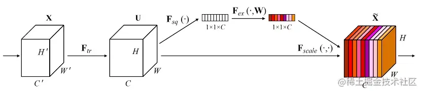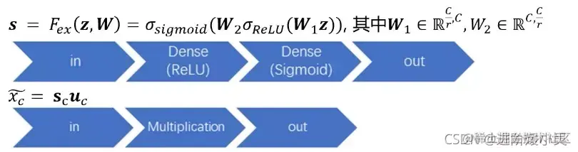 其次是 Excitation 操作,它是一个类似于循环神经网络中门的机制。通过参数 w 来为每个特征通道生成权重,其中参数 w 被学习用来显式地建模特征通道间的相关性。