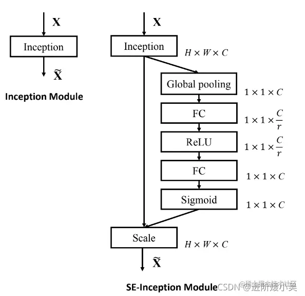 原始Inception模块(左)和SE-Inception模块(右)的架构。