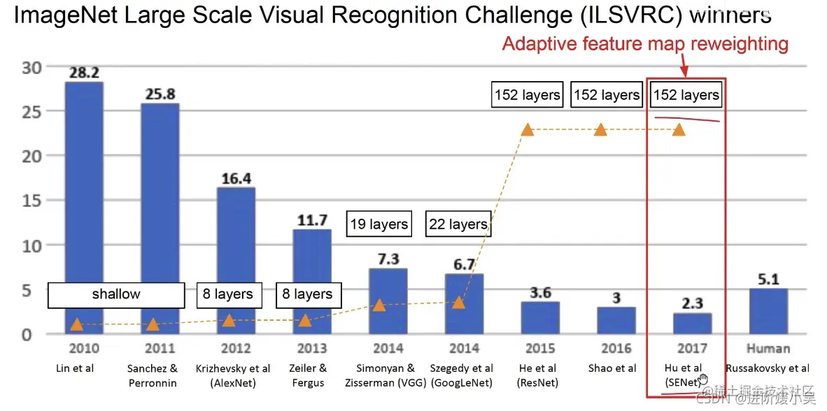 SENet获得了ImageNet2017大赛分类任务的冠军,这也是最后一届ImageNet比赛,论文同时获得了CVPR2018的oral。而且,SENet思路简单,实现方便,计算量小,模块化涉及,可以无缝嵌入主流的网络结构中,实践不断证明其可以使得网络获得更好的任务效果。