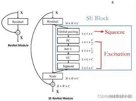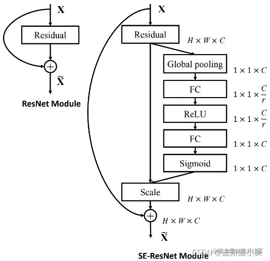 原始Residual模块(左)和SE-ResNet模块(右)的模式。