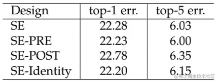 三种变体:(1)SE-PRE块,其中SEblock在残差单元之前移动;(2)SE-POST块,其中SE单元在与恒等分支求和后移动(在ReLU之后)和(3)SE-Identity 块,其中SE单元放置在与残差单元平行的恒等连接上。这些变体如图5 所示,每个变体的性能在表14中报告。我们观察到SE-PRE、SE-Identity和提议的SE块的性能相似。