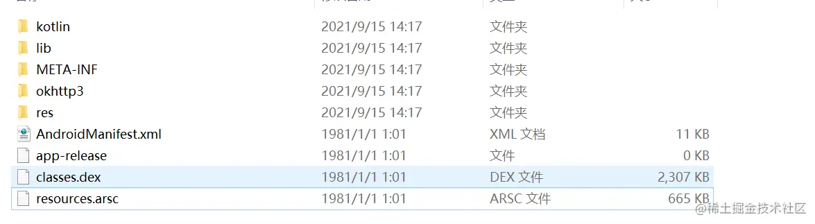 - classes.dex:包含以 Dalvik/ART 虚拟机可理解的 DEX 文件格式编译的类。