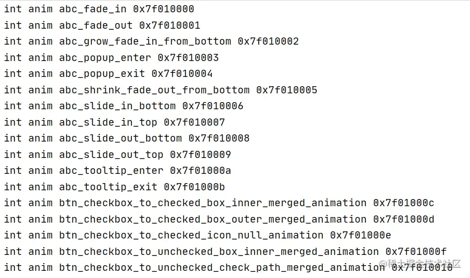 可以看出,R 文件 中的资源 ID 是一个 4 字节的无符号整数,用 16 进制表示。其中,最高的 1 字节表示 Package ID,次高的 1 个字节表示 Type ID,最低的 2 字节表示 Entry ID。