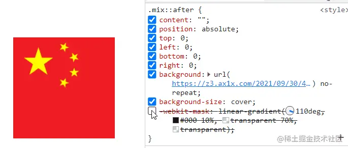 只需要在 div::after 中,设置一层 mask 遮罩 mask: linear-gradient(110deg, #000 10%, transparent 70%, transparent),我们就可以实现头像与国旗的巧妙叠: