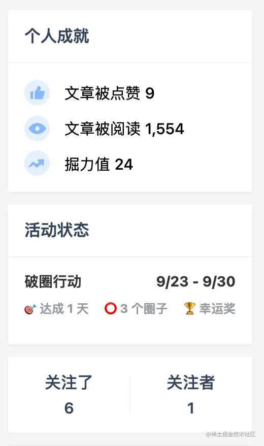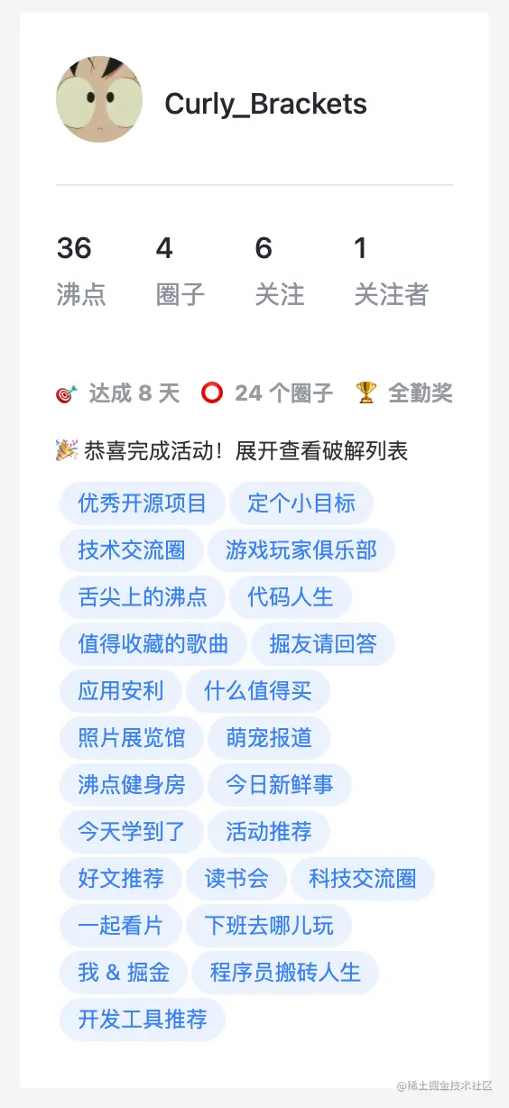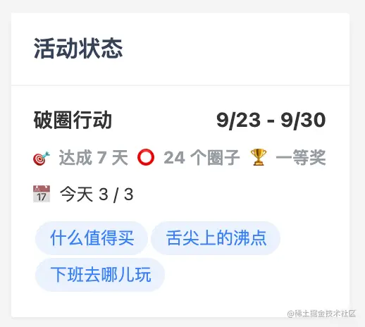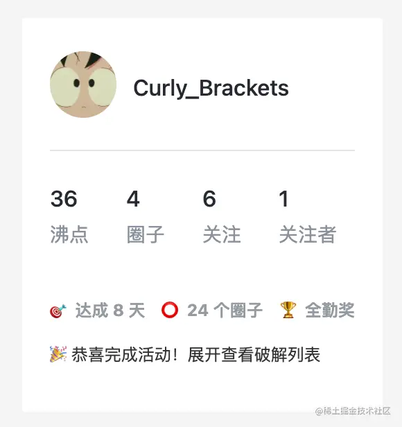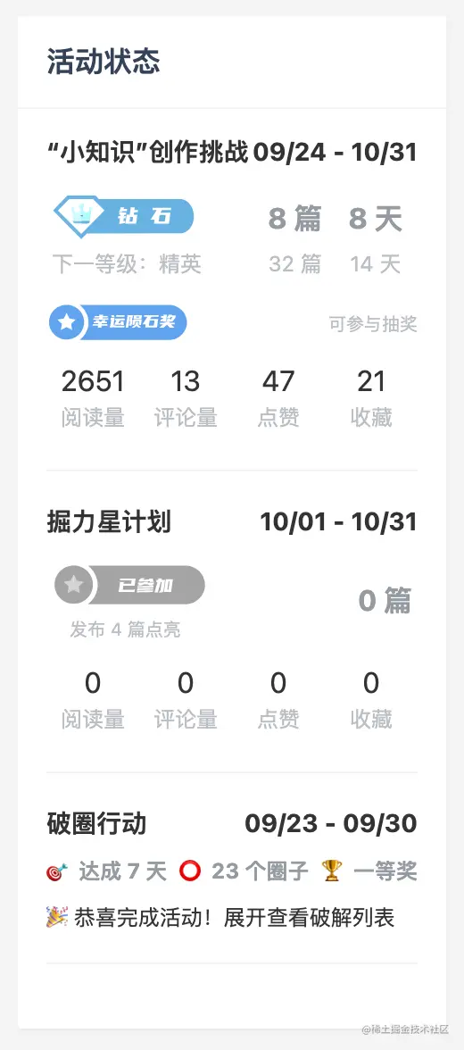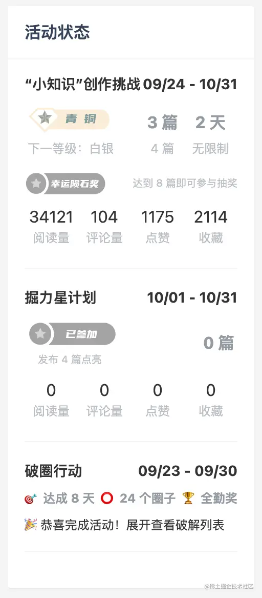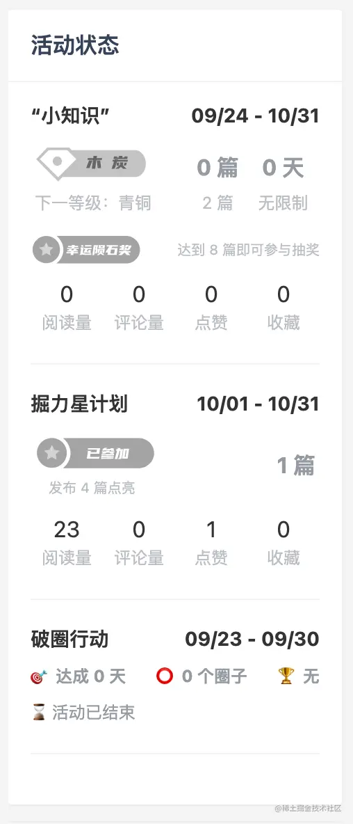 因此我写了一个油猴脚本【掘金活动小助手】,小助手会跟进掘金上线的活动,将完成进度、数据统计显示在个人主页上。
