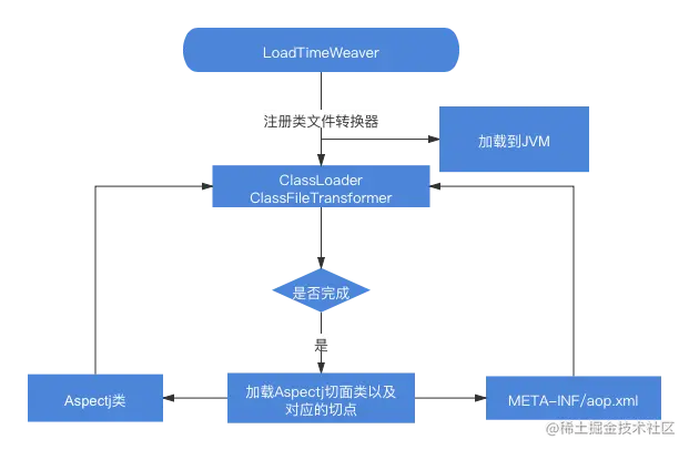 Spring LTW通过读取classpath下META-INF/aop.xml文件,获取切面类和要被切面织入的目标类的相关信息,通过LoadTimeWeaver在ClassLoader加载类文件时将切面织入目标类中。