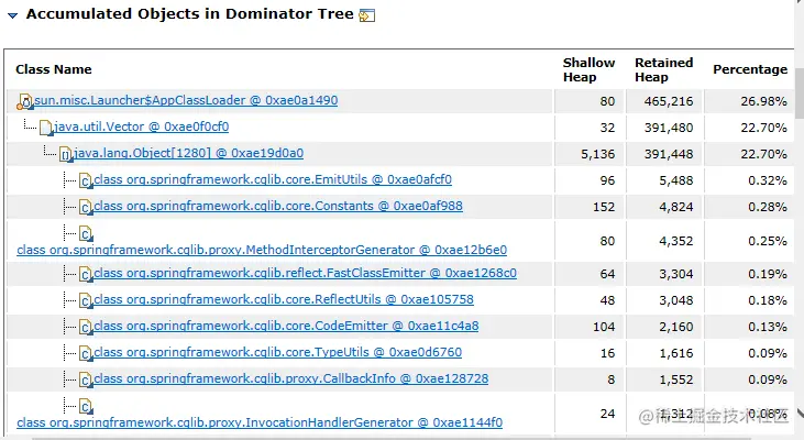 此时可以找到java_pid21896.hprof文件。使用MAT分析文件可知,我们利用cglib创建了太多类。