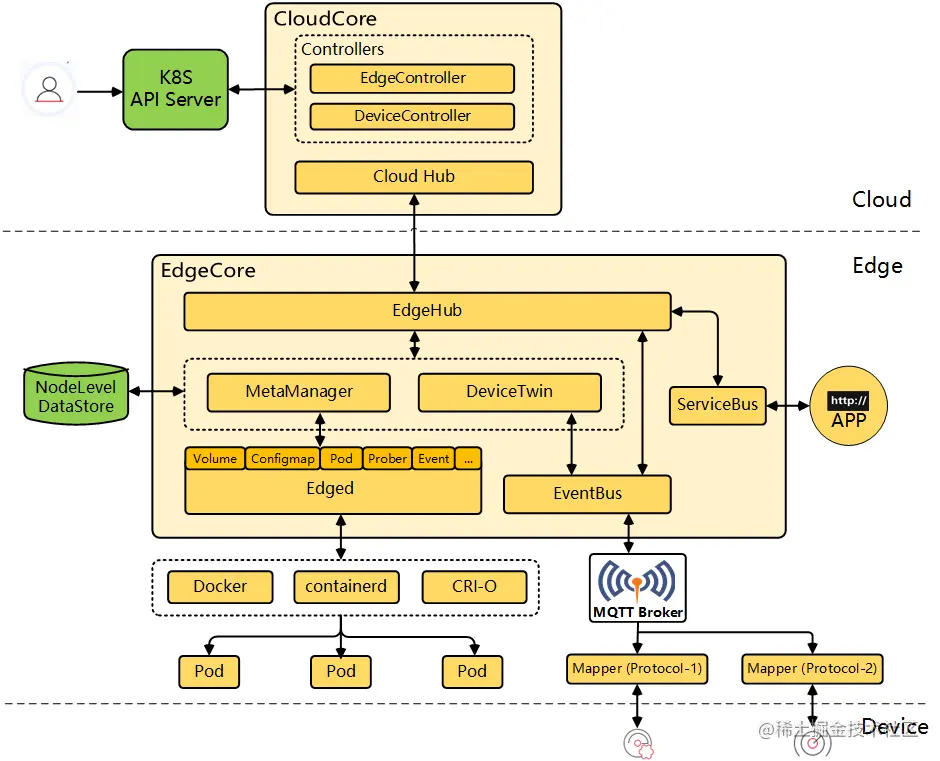 - EdgeController: EdgeController 是一个扩展的 Kubernetes 控制器,管理边缘节点和 Pods 的元数据确保数据能够传递到指定的边缘节点。