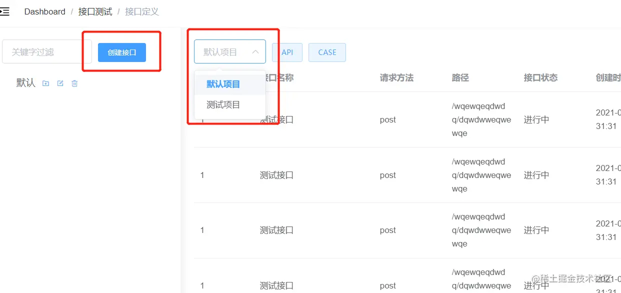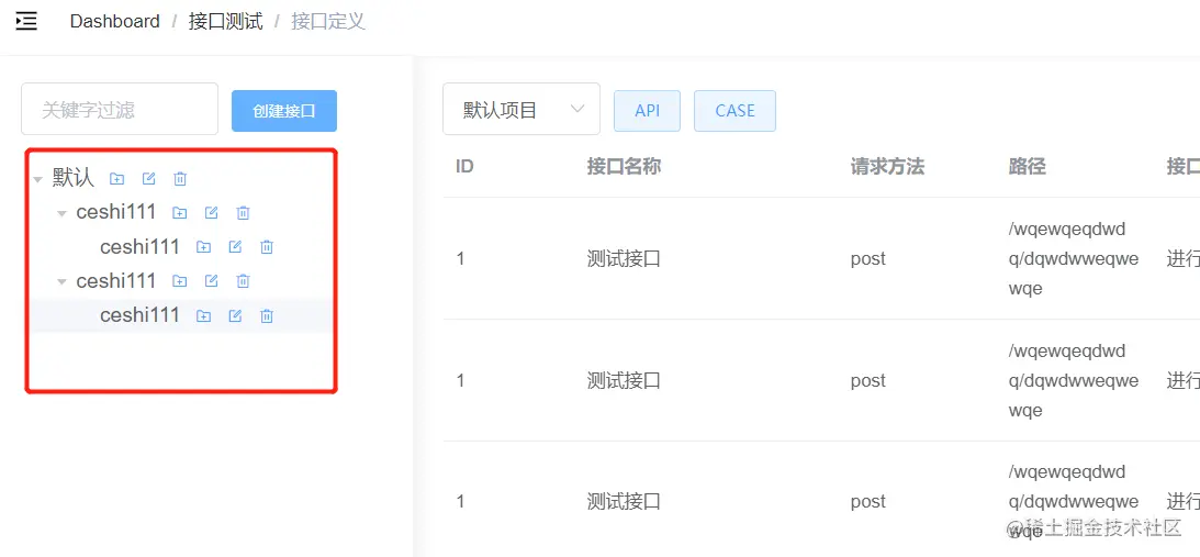 那么我把触发模块树接口的事件放在【创建接口】这个按钮上,点击按钮就会请求接口。