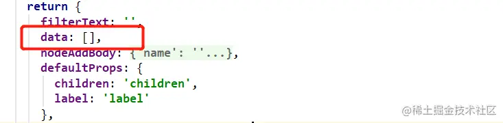 在 return 里,tree组件绑定的是 data ,之前直接写死的数据,现在删掉,就是一个空数组[]。
