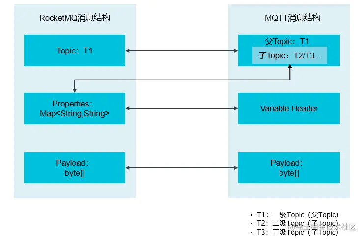而二级和三级 Topic 则映射到消息队列 RocketMQ 版的消息属性(Properties)中。
