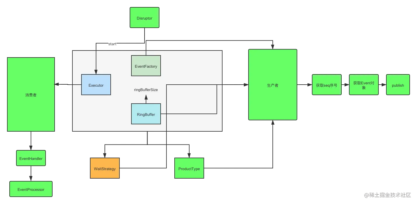 上图简单的画了一下构建Disruptor的各个参数以及 ringBuffer 的构造,下面简单的说一下。