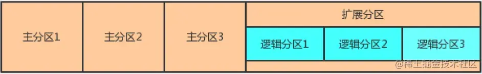 - MBR:MBR信息存在于磁盘最开始的512字节(第一个扇区)中,这个扇区中有磁盘主引导记录(MBR)以及分区表,其中分区表仅占64字节,本身只能记录四块分区(分区本身就是对分区表进行设置)。 只能分四个区太少了,于是就有了扩展分区的概念,扩展分区的分区信息记录在额外的扇区中。