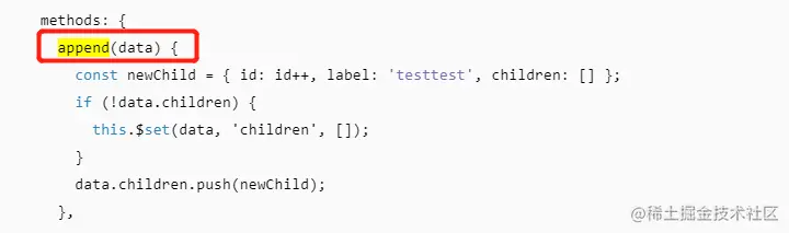 在elementUI 树控件下有个append方法,可以用来为 Tree 中的一个节点追加一个子节点。