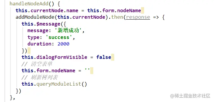 在对话框里输入节点名称,点击保存,就好调用handleNodeAdd方法来请求后端接口。