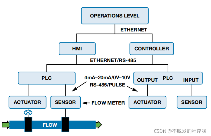 下图显示采用流量计和执行器控制液体流速的基本过程控制系统。在最低的水平处,诸如温度、流速和气体浓度等过程变量通过输入模块监控,该模块通常是可编程逻辑控制器(PLC)的一部分。这些信息由比例-积分-微分(PID)环路在内部处理。PLC利用这些信息来设置输出,控制稳态过程。过程数据、诊断和其他信息可向上传递至操作层,而命令、参数和校准数据可向下传递至传感器和执行器。