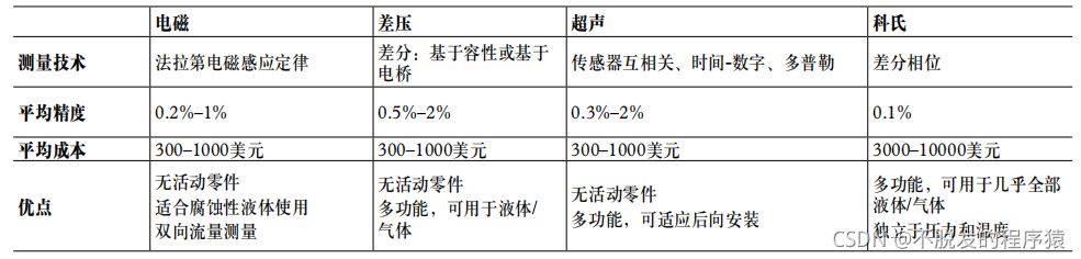 电磁流量计也能提供无创检测。这些设备可用于酸性、碱性和离子液体——这些液体的电导率范围为 10 S/m至 10–6 S/m,并且可以是干净、肮脏、腐蚀性、侵蚀性或粘性的液体或浆体,但不适用于碳氢化合物或气体流量测量。它们能够针对直径小至大约 0.125 英寸、最大容量为 10 立方英尺的低流速和高流速提供相对较高的系统精度(0.2%),并且哪怕在更低的流速下也能保持读数的可重复性。它们可以测量双向流量,即上游或下游。下表比较了几种常见的流量计技术: