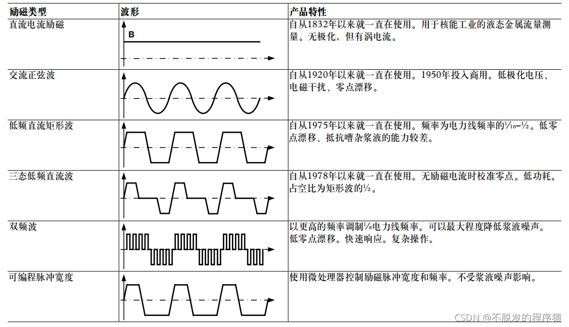 流过励磁线圈的电流产生受控磁场,专用励磁波形是电磁流量计的一个重要方面,在实际应用中会使用多种类型,包括低频矩形波、电力线频率正弦波、双频波和可编程脉冲宽度。下表显示各种传感器线圈的励磁波形: