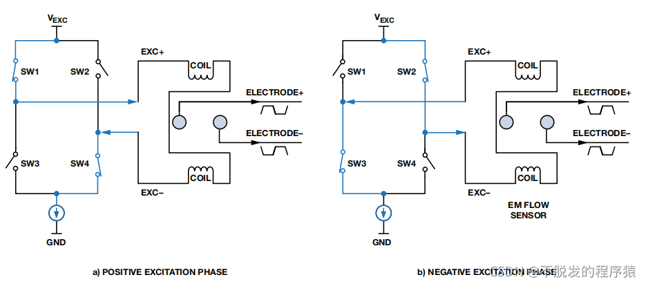 大部分应用采用低频直流矩形波励磁 ⁄25、 ⁄16、 ⁄10、 ⁄8、 ⁄4 或⁄2 电力线频率(50 Hz/60 Hz)的传感器线圈。低频励磁具有恒定的幅度和方向交替变化的电流,实现低频零漂移性能。电流方向采用晶体管或场效应管H电桥进行切换。若SW1 和SW4 导通,而SW2 和SW3 关闭(图 3),则传感器线圈处于正相位励磁期间;同时,恒定电流进入EXC+并流出EXC– 。若SW1和SW4 关闭,而SW2 和SW3 导通(图 3),则传感器线圈处于负相位励磁期间;同时,恒定电流进入EXC–并流出EXC+。