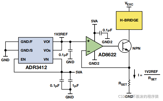 电磁流量计的励磁电流相比其他流量测量技术而言非常大,其范围为 125 mA至 250 mA,覆盖线路供电式流量计的主要范围。高达 500 mA或 1 A的电流将用于直径更大的管道。下图所示电路可以产生精密 250 mA传感器线圈励磁。8 ppm/°C基准电压源ADR3412 提供实现电流偏置的 1.2 V设定点。