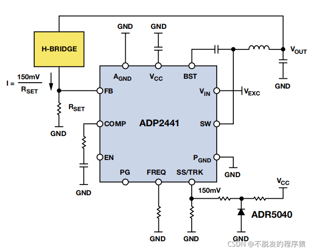 具有开关模式电源的恒流源正成为更流行的传感器线圈励磁方法。下图显示同步降压DC-DC调节器ADP2441 配置为恒流源输出。这项技术可以消除使用线性电流源的功率损失,并可极大地改善系统性能。