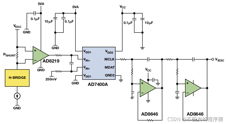 功率更高的系统采用电流检测诊断功能监测随负载、电源、时间和温度变化的电流改变,同时还能检测传感器线圈开路。分流放大器AD8219 可用来监测 80 V共模电压范围内 60 V/V增益和 0.3%精度的励磁电流。隔离式电流放大器采用隔离式Σ-∆调制器 AD7400A 以及轨到轨运算放大器 AD8646 如下图所示。AD7400 的输出通过四阶低通滤波器处理,以便重构检测输出。