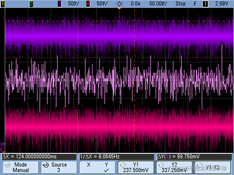 如果两个电极采用相同的材料,并且具有相同的表面状况,那么它们的电位应当相等。然而,事实上,极化电位会像低频交流信号那样缓慢波动,因为流体和电极之间存在物理摩擦或电化学效应。任何失配都将表现为差模噪声。偏置电压与电极电位共同组成共模电压,在第一级放大器输入端产生几百mV至大约1 V的共模电压;因此,电子器件必须具有适当的共模抑制能力。下图显示差分系统的单电极电位,该系统#316不锈钢电极的偏置为0.28 VDC,噪声为0.1 VP-P;电极安装在直径为50 mm的水管上。