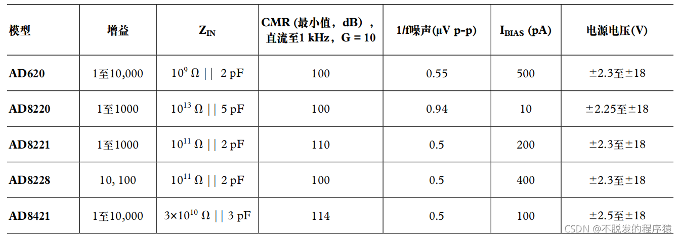 代表性仪表放大器规格