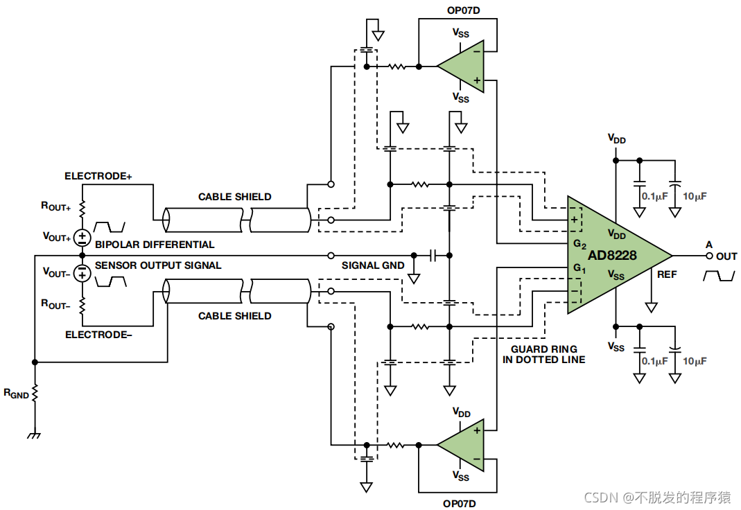 下图显示采用精密仪表放大器 AD8228 的流量计。前端放大器抑制共模电压,同时放大微弱的传感器信号。该流量计合理的布局以及经激光调整的电阻允许其提供有保证的增益误差、增益漂移和共模抑制规格。为了较大程度降低泄漏电流,可以通 过对输入电压进行采样,并将缓冲电压连接至输入信号路径周围的未屏蔽走线,从而保护高阻抗传感器输出。 第一级的增益通常为 10 至 20,但不会更高,因为低电平信号必须经过放大才能进行后期处理,同时保持较小的直流失调,避免后级电路饱和。