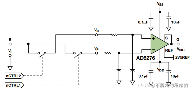 低功耗、低成本、单位增益差动放大器AD8276以 5 V满量程输入范围与ADC实现接口。因此,其REF引脚连接 2.5 V基准电压源,并对双极性输出进行电平转换处理,将其转换为单极性范围。高于 2.5 V的输出表示正向流动,而低于 2.5 V则表示反向流动。