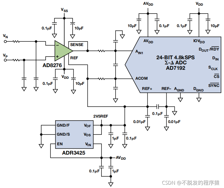 下显示ADC子电路,包括解调器输出和微功耗、高精度 2.5V基准电压源ADR3425。