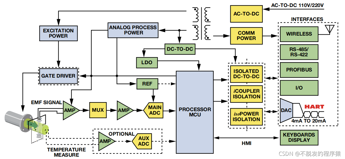 传感器励磁和测量表示整体系统性能,因为电极产生的mV级信号最终转换为流量结果。流速信号通过多种协议传送至系统控制器,包括RS-485 和 4 mA至 20 mA电流环路。电流环路的重要优势是它不受线路压降的影响,可以实现长距离通信,并且相比电压通信更不容易受到噪声干扰影响。在工厂自动化应 用中,数字总线协议更为常用,使用差分电压模式信号通过较短的距离便可提供高速通信。下图显示使用HART的4 mA至 20 mA采样电路: