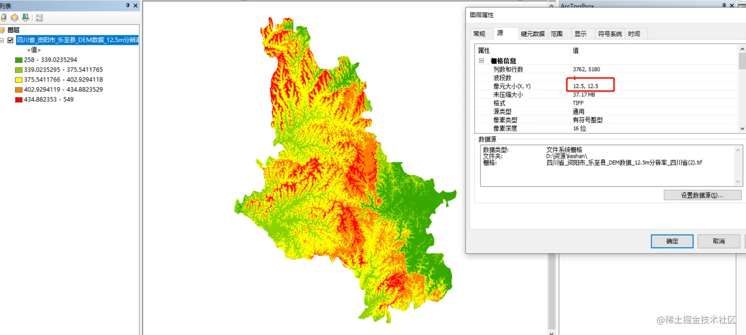 裁剪得到了全国2700多个县12.5m的DEM影像。以加载四川省-资阳市-乐至县的DEM数据为例。