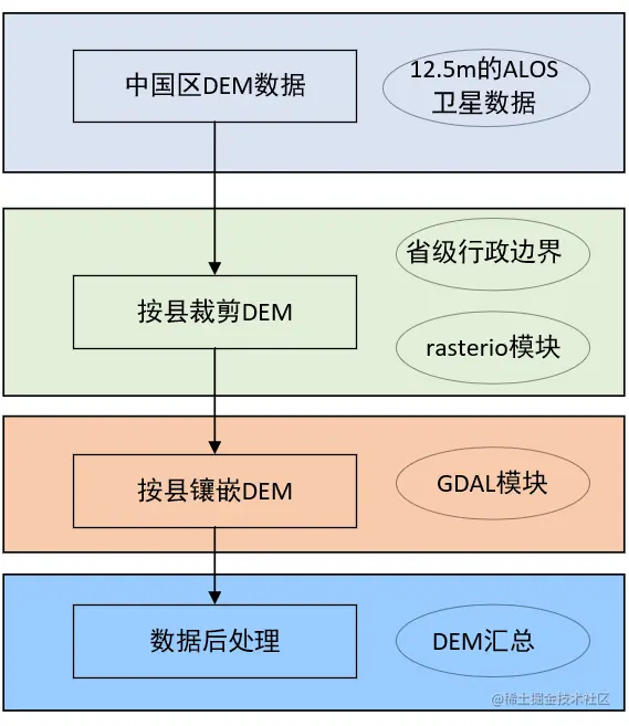 总体思路是:全国12.5m的DEM数据筛选、按县级单位进行裁剪、镶嵌,结果数据后处理。