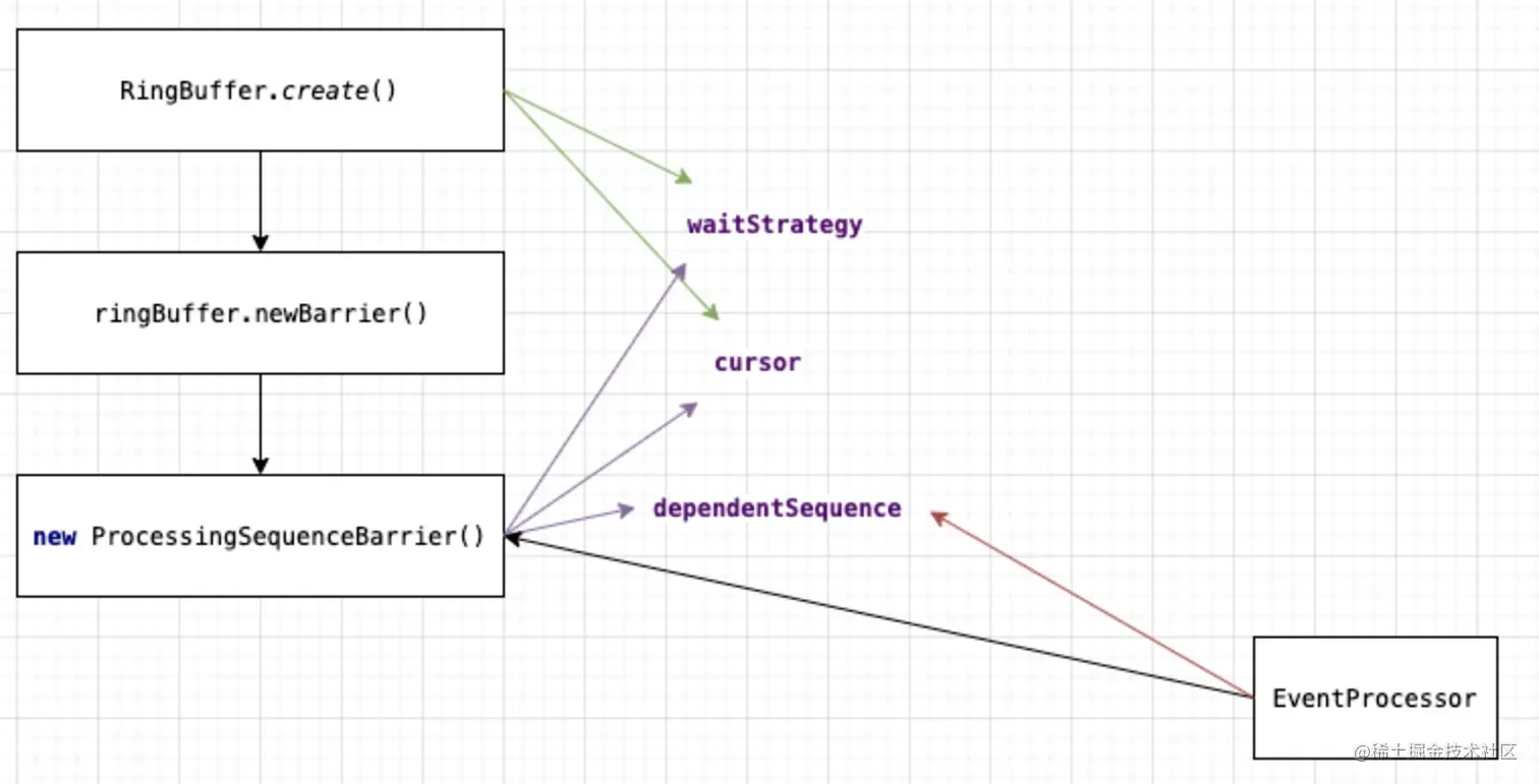 由图可以看出,在获得可用序号时,SequenceBarrier 在 EventProcessor 和 RingBuffer中充当协调的角色。