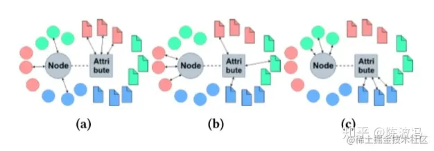 同一种颜色属于一个community。正常情况下一个commnuity的团体在属性和结构上更加相似(紧密)。 异常a(结构异常):属性上属于红色的community(正常),结构上和其它community的节点有连接。 异常b(属性异常):结构上属于红色的community(正常),属性上和其它community的属性比较相似,也就是说在 只从属性上看, 这个节点并不完全遵从红色社区的模式。 异常c(综合异常):节点上属于绿色社区,属性上属于蓝色社区。也就是在 属性上和结构上都存在异常。